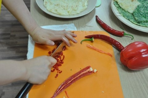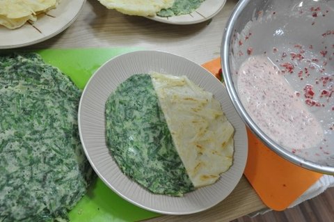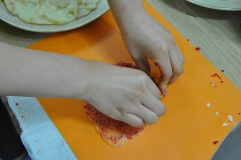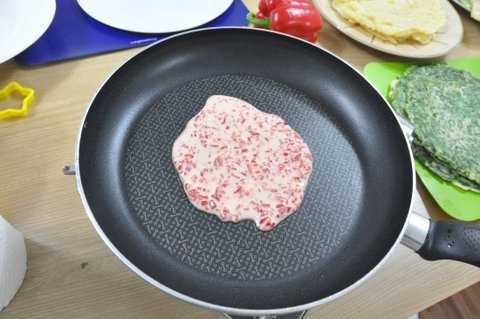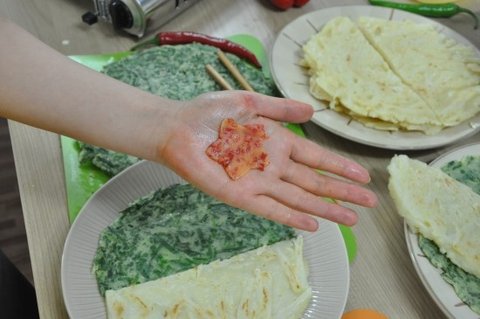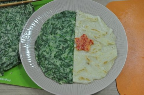 전을 얇게 펴서 고추 전을 만들어 줍니다. 딱 별과 달 크기의 미니 사이즈 전이예요.