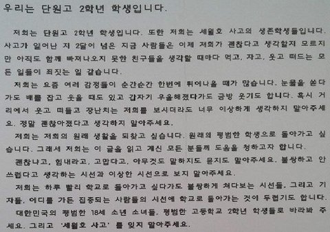 잠시 잊고 있었네 솔직히 언제까지 기억될지 모르겠지만 절대로 잊어서는 안될 사건임이 분명한데..요즘 나라가 너무 뒤숭숭해 유씨가 빨리 잡혀야 할텐데 남아있는 희생자분들도 하루빨리 돌아오셨으면ㅠ