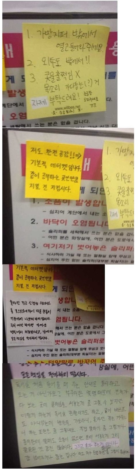 솔직히 평소에 열람실 사용할때 서로 생각해서 피해안볼수 있게 저렇게 하는 편이지만 일반적으로 강요하는 저런글을 보면 나같아도 기분 나빠서 평소에 하던것도 안할거 같음