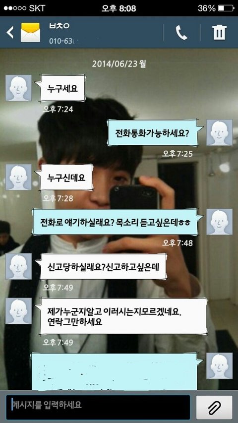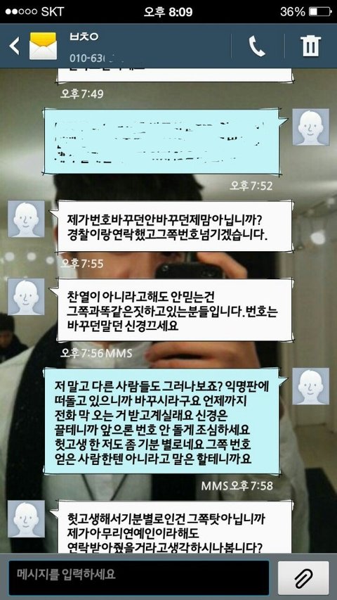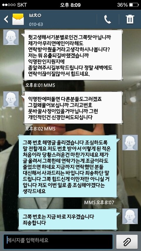 ㅅ사실 예전에 백혐이 사건 터지기 전에 걔 번호라고 굴러다니는 거 주워서 저장해놓은 거긴 한데 이번에 너네가 캡쳐해서 올린 카톡에 뜬상메? 프사 배사도 그렇고 니들 말도 그렇고 그냥 조카 ㅂㅊㅇ같은거야 그래서 조카 미쳤는지 발표제도 안걸고 전화를 걸었다? 사실 발표제 걸면 걔네 안받는다길래 막걸었어 당연히 전화는 거절하고 문자가 온거야 위에 사진 보면 알겠지만 누구세요라고 왔는데 일단 나는 ㅂㅊㅇ인거 확신하고 목소리 듣고싶다고 싹수 노랗게 보냈지 지금 나 조카 후회중이라니까ㅠㅠㅠㅠ여튼 저분도 화났는지 나랑 저래저래 대화를 했다? 솔직히 말하면 저분이 나 경찰에 넘긴다했을때 개쫌..ㅋㅋㅋ찌질하긴한데 나는 사생도 아니고 그냥 안방에서 판이랑 인티 굴러다니는거 수집하는 곰이거든? 여튼 그래서 나는 저런게 처음이었단 말이야 저분한테 문자왔을때도 개당황타서 어 어쩌지 막그러고 어휴 어쨌는 내가 벌받은거지뭐ㅠㅠ 아무튼 저분한테 사과는 드렸고 받아주신것 같아서 염치불구하고 판에 글쓰러왔다ㅠㅠㅠ나는 이미 넘어간것같으니까 너희라도 조심하라구ㅠㅠㅠ많이 힘드시단것같아 카톡문자전화 특히 새벽에 하는거! 자제좀 하고ㅠㅠㅠㅠ혹시 63저번호가 찐이더라고 삭제 누르자제발ㅠㅠㅠ혹시 저 번호가 긴가민가하는 애들있으면 번호 잠깐 공개할게ㅠㅠㅠ제발 그러지말자