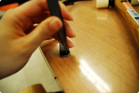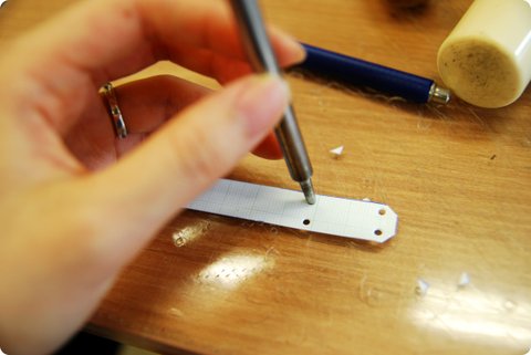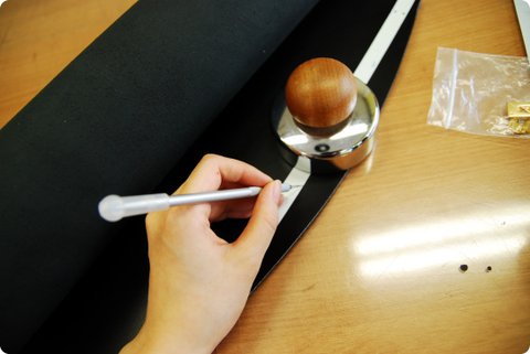 길이를 정하셨으면 장식의 나사 구멍을 뚫어주세요.  위치는 금속장식으로 자국을 낸 다음에 해주시면 정확하게 뚫을 수 있어요.