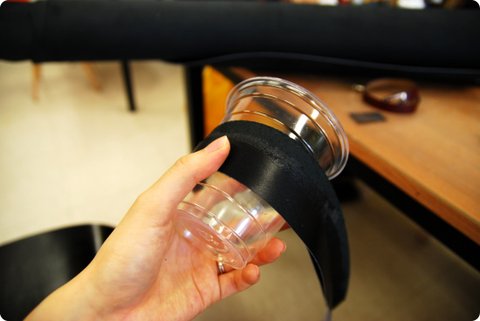이제 두 가죽을 붙이셔야 하는데 이 때 조심하셔야 할 것은 꼭 둥글게 붙이셔야 한다는거에요. 외피가 위로오게 하신 다음, 밑에 컵을 받치고 천천히 붙여줍니다.
