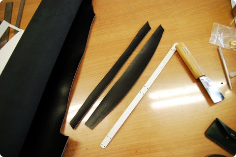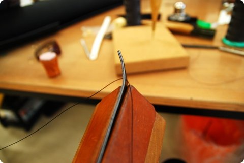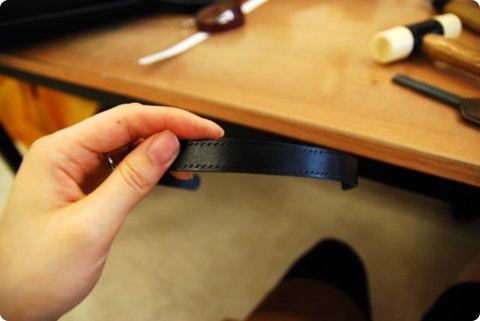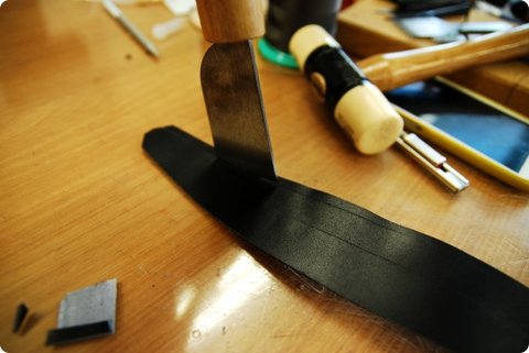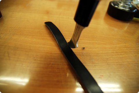 이제 칼로 가죽을 잘라줍니다. 여기서도 중요한 것은 정확성 !! 칼이 송곳선을 정확히 물고 지나가게 잘라주세요. 재단면이 수직이 되어야 합니다.