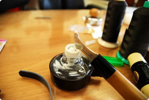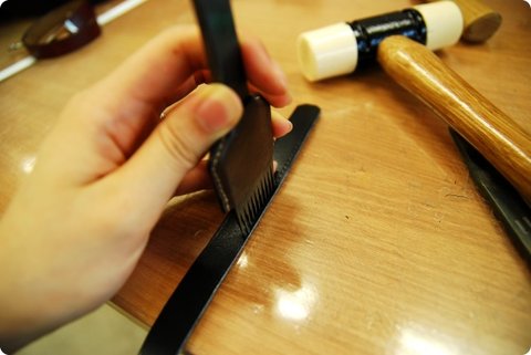 달구셨으면 가죽에 선을 그어줍니다. 이 때도 집중하셔야해요. 힘을 너무 세게 주면 빗겨나갈 수 있어요. 빗겨나가면 가죽이 상하겠죠? ㅠ ㅠ
