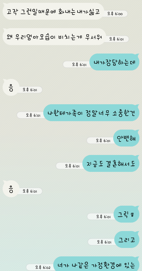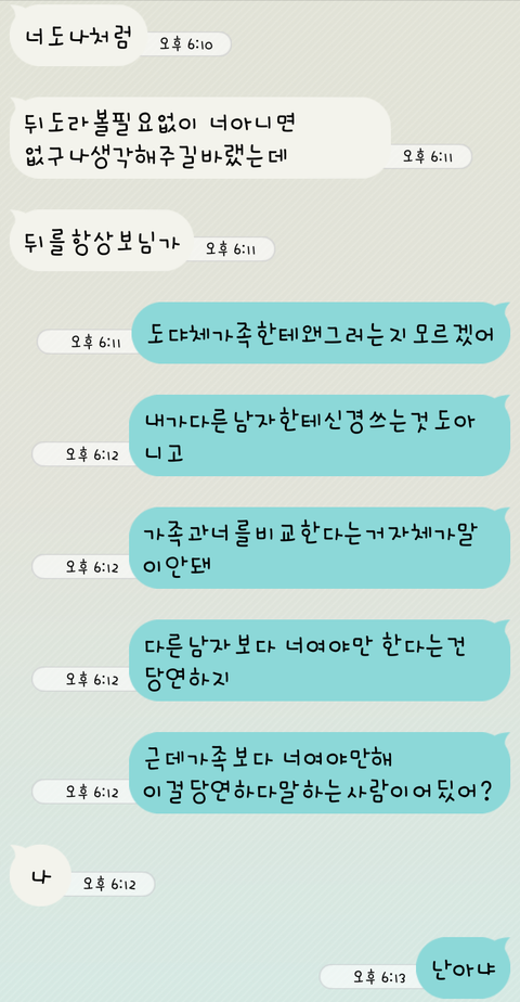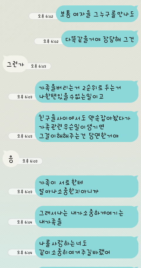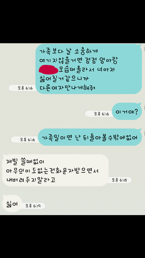 여기서 하나 말씀드릴 건 제 남친이 가정사가 좀 안좋아서 혼자나와살아요 그래서 가족에 대한 정이나 사랑이 별로 없고 제가 가족을 중요시하는걸 이해를못해요....
