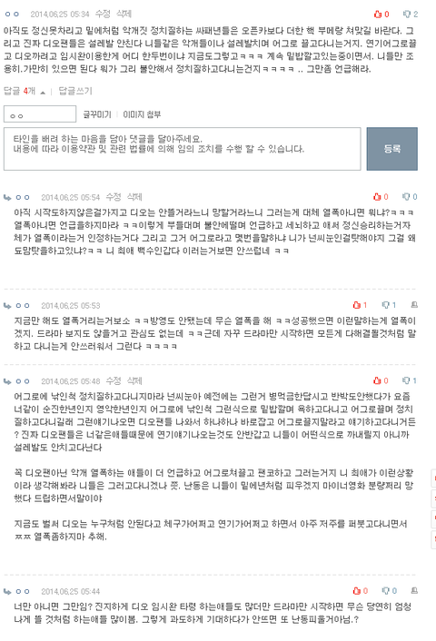 한심한것들 역대급 부메랑 쳐맞길바란다. 근데 지들이 디오 연기가지고 설레발치며정치질하는것은 뭐 악개짓이라고 생각도안하는애들이겠지 그러니 저런글에 추천박고댓글에서도 대놓고 악개짓하고있지. 니들이야말로 언급말고 설레발그만치고아직 시작하지도않은거에 재뿌리며 누구처럼 안될거라며 정치질하고다니지마라. 어그로에 낚인척 지들이 그렇게 말하고다녀놓고 디오맘이 뭐라 말하고다녔다며그거 이용해서 정치질하지말고.