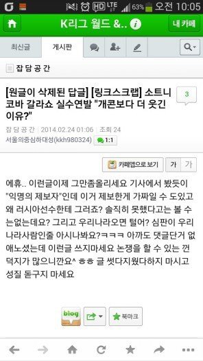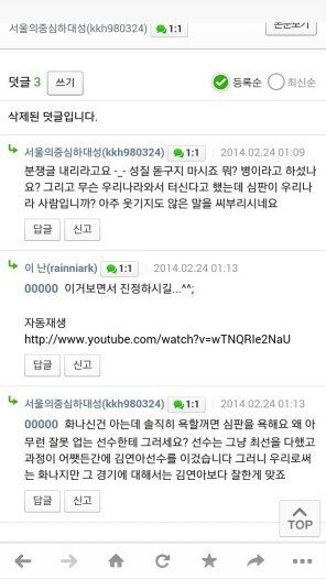 소트니코바보다 김연아가 떨어진다고 비꼬는 글과 댓글을 올려대고있네요 본인이 잘못한게 전혀 없다고 저따위로 나대고 뻔뻔하네요