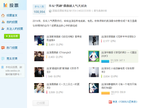 중국에서 기대되는 연기돌 투표중인데 루한이가 둘기한테 밀리고 있다고 해서