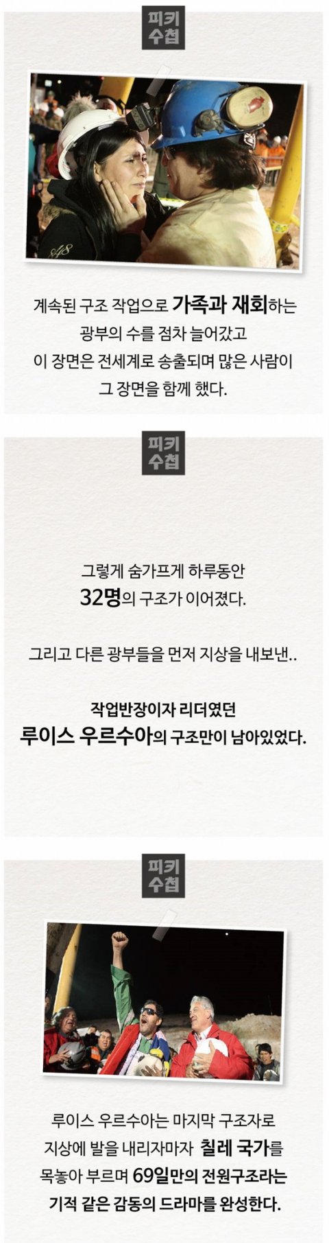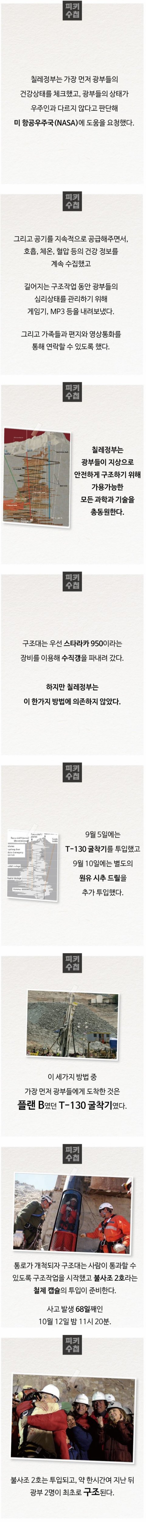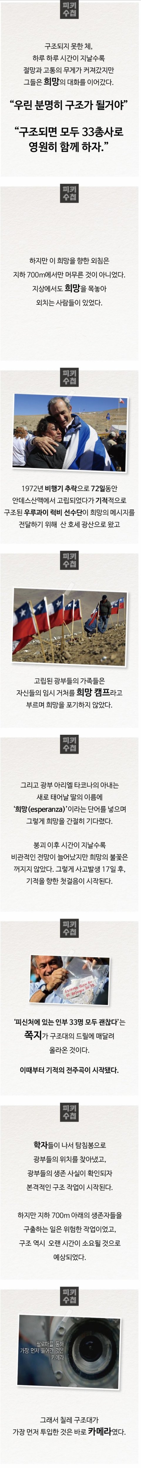 진짜 정부가 적극적으로 지원함 진짜 우리나라랑 비교댐 저거 기계 사건 나고 만든거임 사람들 구할려고 나사에서 만들었다함 그리고 사건현장 지휘자가 인터뷰에서 당신은 영웅입니다 라고 하니까 영웅은 살아서 돌아온33명의 인부라고 말함..티비에서봄 지휘자가 대책이 진짜 냉정했다고 함 구조에 대한건 분석해서 철저히 보고 .. 짱임 저런 사람이 우리나라에 사고대책본부 책임자로 있으면 신뢰할수 있을듯
