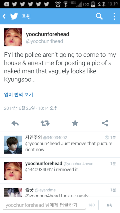 해석: 경수닮은남자의 누드사진을올린걸로 경찰이 집에찾아오거나 체포해가지않을거다