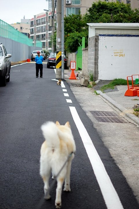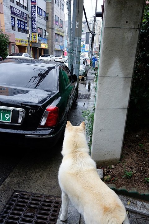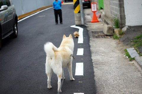 동네 산책 나왔어요. 고양이를 찾아서 두리번 거리는 심바