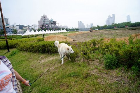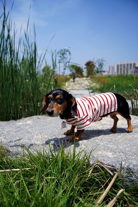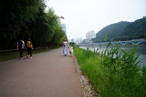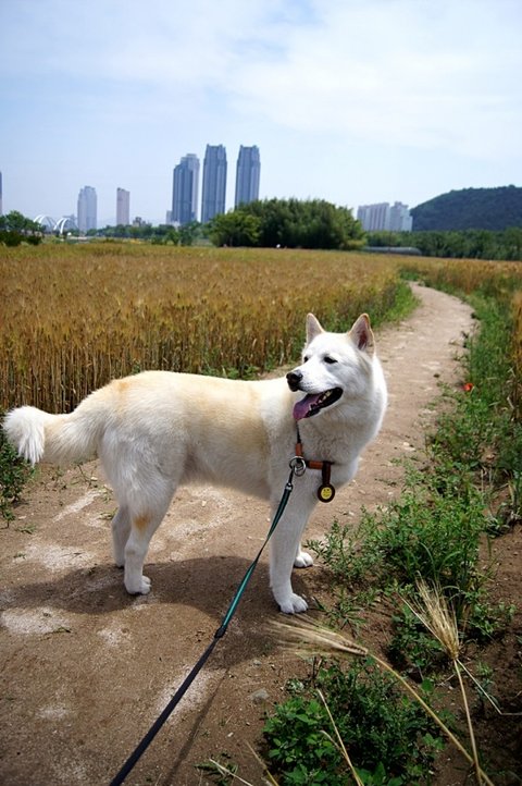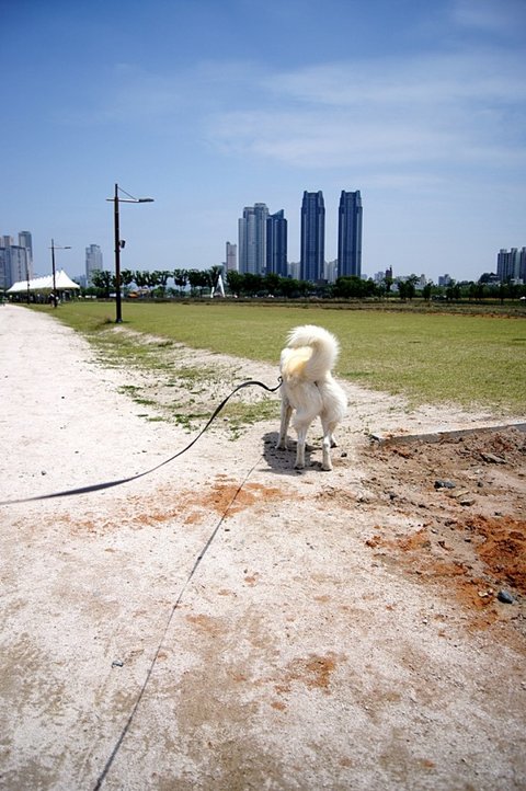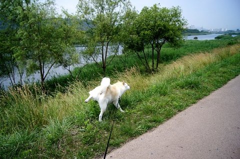 강변 산책로에서 킁킁. 공기 냄새를 맡고 있어요. 공원오면 더 많이 킁킁 거려요