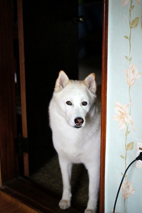 새초롬.. 문틀 옆에서 산책 가자고 눈빛을 보내고 있어요.