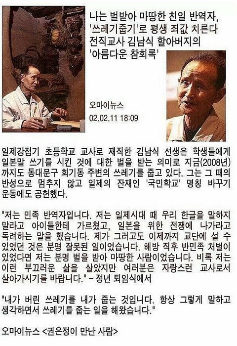 우리나라친일파는세월이흘러다죽었고 그자손들이죄책감느껴 위할아버지처럼청소한다면 우리나라는세계제일로깨끗해지겠다