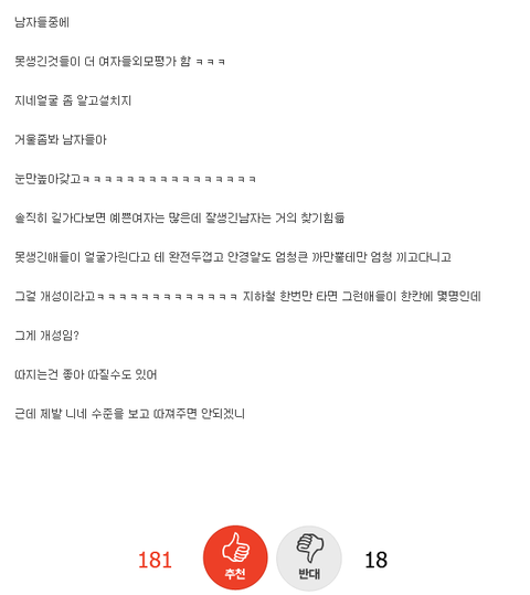 "여자도 자신의 수준은 보지도 못하고 남자 능력 따지지 마시고 본인 능력이나 높이세요"
