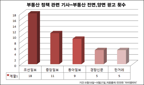 부동산 정책이나 관련 기사가 나오는 기간의 조중동과 경향신문, 한겨레 신문의 부동산 광고 횟수를 보면 조선일보는 한겨레에 비해 3배 이상 높았습니다.