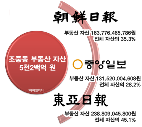 조중동의 부동산 자산만 따져도 5천2백억 원에 달합니다. 조중동은 주식시장의 주식 등락처럼 부동산 시장에 민감할 수밖에 없는 태생적 구조를 안고 있는 언론사입니다.