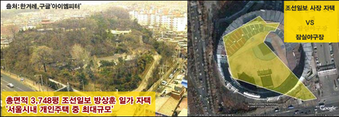 방상훈 조선일보 사장 일가의 자택은 서울시내 개인 주택 중 최대규모인 3,748평입니다. 청와대 관저 (건평 444평, 앞마당 477평) 이건희 삼성그룹 회장 (대지 400평, 건평 350평)과 비교해도 훨씬 많습니다.