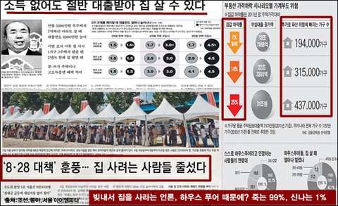 '하우스푸어'가 문제이니 부동산 활성화를 해야 한다며, 빚을 내서 집을 사라고 조중동과 박근혜정권은 주장하고 있습니다. 이들의 언론조작과 왜곡에 휘말려 피해를 보는 사람은 중산층과 서민이고 이득을 보는 사람은 땅부자와 건설사뿐입니다.