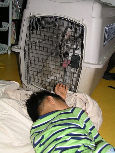 솔양 씻겨서 켄넬에 넣어뒀더니.. 그 앞에서 솔이 심심하다고 놀아주다 잠 든 훈군