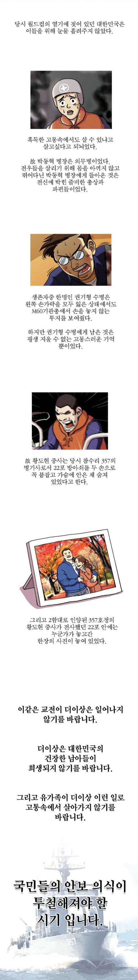 근데 십년이넘는 시간이 흘렀는데 안보의식은 무슨 잊지말아야 할 날만 늘어가고 있으니 바다에서 억울하게 돌아가신 아해군참수리 병장분들 천안함 피격사건,세월호 참사 피해자 모든 분들의 명복을 빕니다...