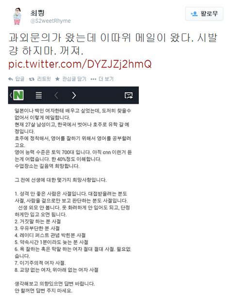 걍 대놓고 말하지. 애인찾는다고ㅋㅋ 까짓 과외선생구하는데 욕이니 위아래니 이기적이니 레이디퍼스트 따질 이유가 있음? 어차피 대화도 방 안에서 할거고 얘기할 사람은 둘뿐이고 대화할 내용도 공부얘기일텐데...? 사심이 들어갔네..