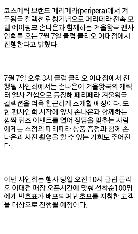 손나은 7월7일 페리페라 이대점에서펜싸한다