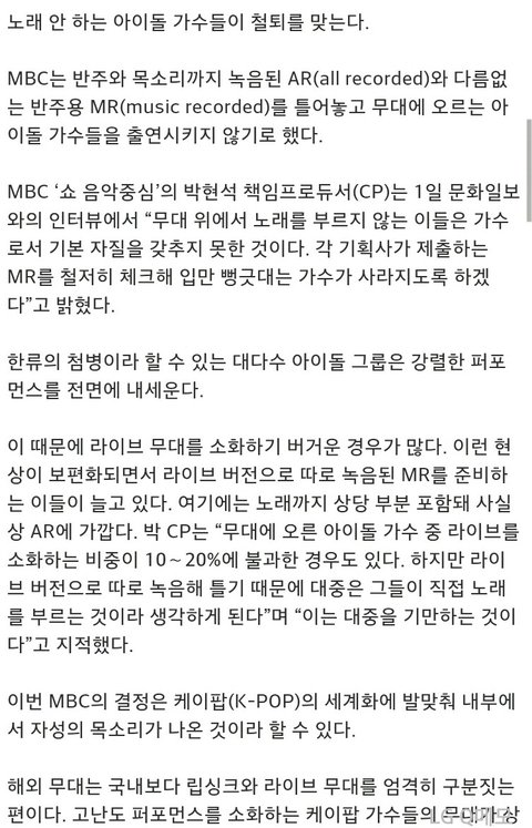 MR은 어느정도까지 허용되는걸까? 따로 후시녹음하는게 당연히 가수로서 자질없는건데피디가 걸러내겠다고 할 정도면 얼마나 많은 팀이 깔고하는거?톄스는 대현이 목갈라져도 쌩목쓰게하니까 우리는 해당사항없을거 같긴한데.음중 쎄게나오네