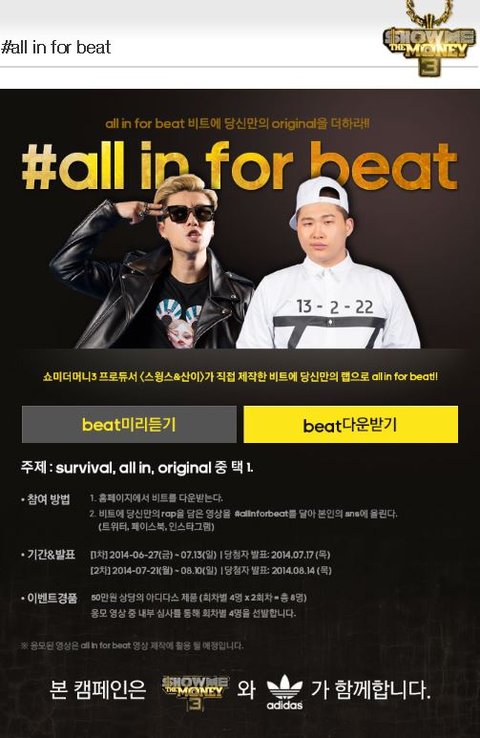 스윙스&산이가 직접 제작한 비트를 다운받고 비트위에 자신만의 rap을 담은 영상을 본인의 SNS에 올리면 끝! 페북, 트위터, 인스타 모두 가능하지만!! 헤쉬테그 #allinforbeat 를 빼먹으면 말짱 꽝! 혼자 트위터에 랩한거 올리는 허세남됨ㅋㅋㅋ