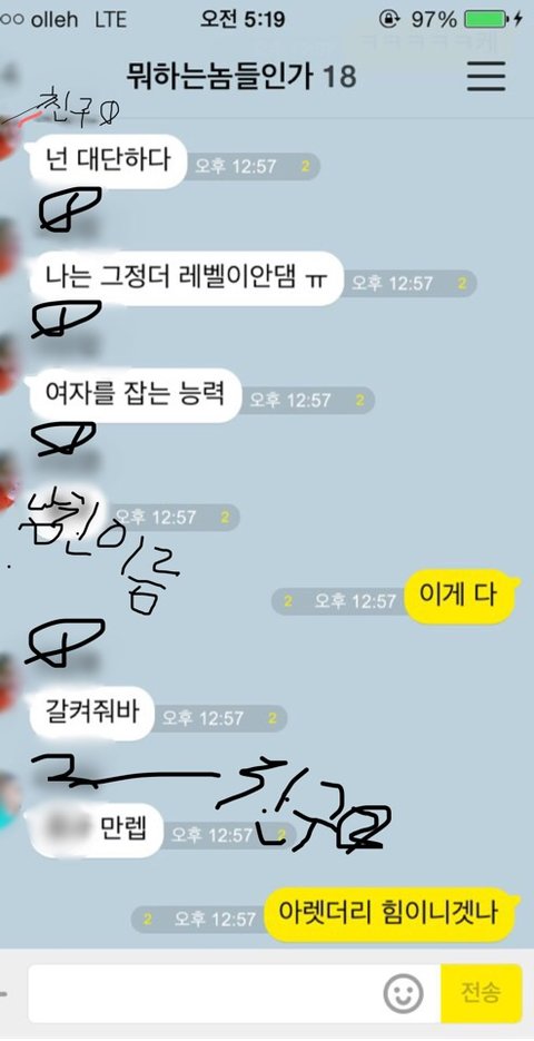 저런얘기바로 밑에 선빵어쩌고해서 혹시나 여자얘긴가 싶엇는데 그냥그건 싸움얘기엿어서 그캡채본들은 삭제햇어요 양해해주세요