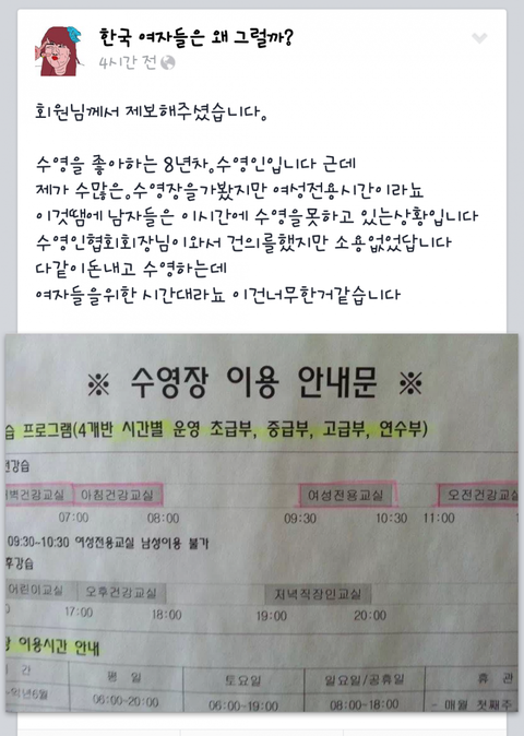일단 난 남자. 군대가기 전에 휴학하고 잠깐 저 시간에 수영 다녀봤는데 솔직히 오전에 수영하는 사람은 95%가 여자임(남편 직장보내고 애들 학교보내고 운동하러 나온 가정주부들이 대부분이고 나머지는 휴학한 여대생이나 백조분들..) 남자는 한 클래스당 한명에서 많으면 두명정도? 남자분들은 새벽시간이나 저녁~밤시간에 많이 오고 반대로 그 시간에는 여자들이 별로 없음. 저기가 국가에서 운영하는 공공시설이면 당연히!! 심각하게 문제제기를 해야겠지만 사기업이 영리목적으로 운영하는거라면 딱히 문제제기를 하기가 애매한듯. 대부분 여자들만 쓰는 시간대니까 그냥 여성전용 걸어놓겠다는 것 같은데, 경영진 마인드에 따라 저런 식으로 할지 말지가 결정되는거겠지 뭐.. 그나저나 여기 여자들 반박수준이 진짜 너무 수준 이하라 실망스럽네;