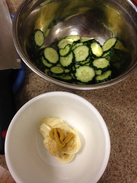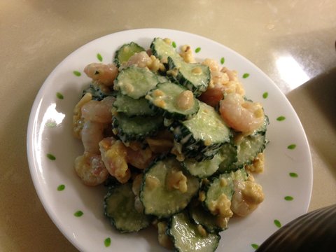 오이와 새우 + 겨자땅콩소스 곁들여서 만든 냉채