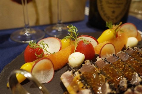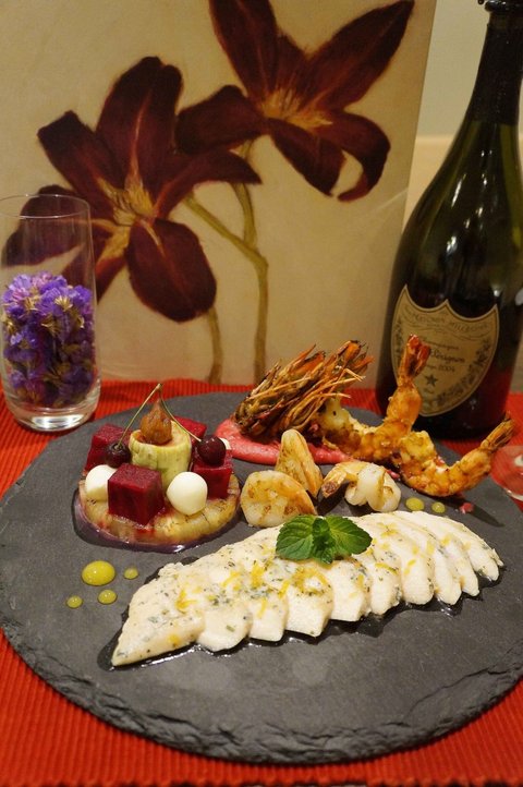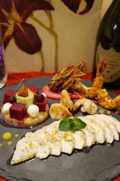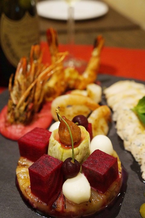 구운 블랙타이거 새우, 시나몬향의 파인애플과 비트 피클