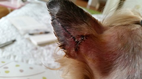 8. 왼쪽귀가 세로로 완전히 분리되어 찢어졌고 10바늘을 봉합하였으며, 목덜미 부분도 물려 봉합을 하였음.