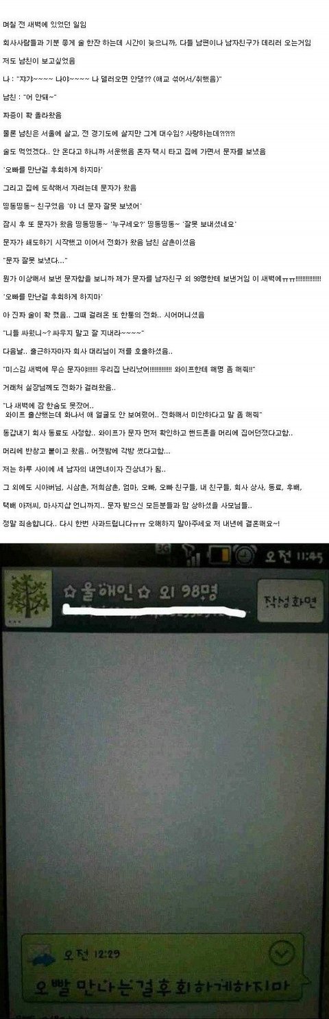 술쳐먹고 집데려다주러 서울에서 경기도로 오라고 전화해놓고 안온다니 만난걸 후회한다는 년 클라스ㅉㅉ 결혼해서는 잘도 살겠다