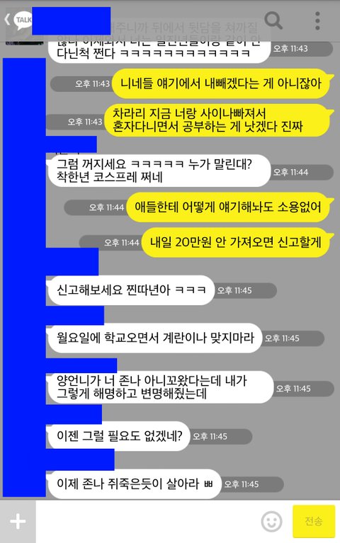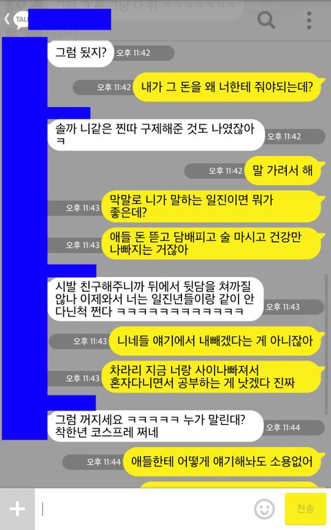 전 진짜 일부러 욕처럼 안 보이게 하려고 그 일진 친구 칭찬도 하면서 어떻게 하면 좋을까라는 식으로 얘기를 했었는데 어제 그 친구에게 카톡이 왔습니다