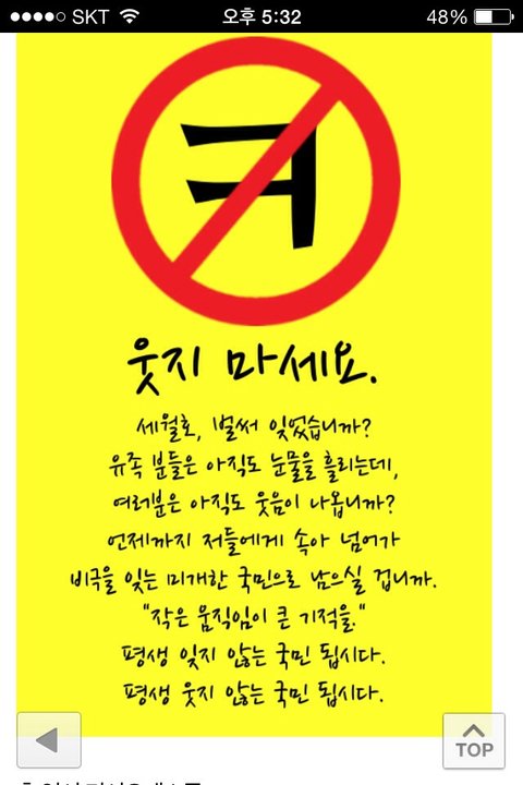 그렇게 따지면 세월호 전에 일어났던 삼풍백화점이나 옛날 독립 운동하시다 돌아가신 분들이 있으니까 우린 원래 웃으면 안되는거였네; 요즘 역사 모르는 사람들이 세월호는 잊혀지지 말아야한다 이러던데 역사부터 알았으면 좋겠다.
