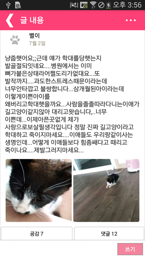 동물에게 사람이 무슨 권한으로 아픔을 주는 것일까요..?아래 글을 읽고 가슴이 먹먹하네요..착한분 만나서 정말 다행입니다..