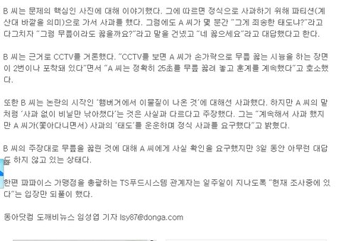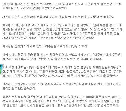 서비스직 종사자를 무시하는 마인드가 바탕에 있지않고서야 자기보다 20세이상 위인 분에게 무릎을 꿇게하는 비도덕적인 행위를 하지는 않겠지요. 저도 서비스직에 몸담고 있지만 각양백태의 고객들을 만나면서 항상 살얼음을 걷는듯 조심하기는 하는데 이런 진상 손님을 만날까 항상 두렵습니다. 상호 신뢰하는 성숙된 사회문화가 형성되기를 이사건을 계기로 간절히 바래봅니다.