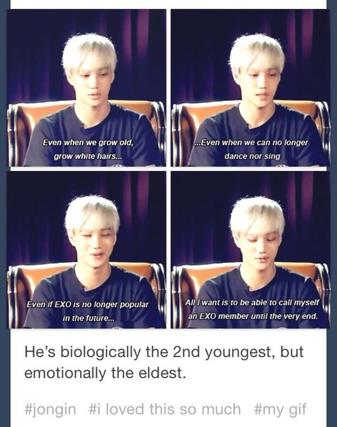 "나중에는 저희가 늙어서 춤도 못추고 노래도 잘못하게 될수도 있고 인기가 많이 없어질 수도 있지만 끝까지 엑소로서 잘했으면 좋겠어요"