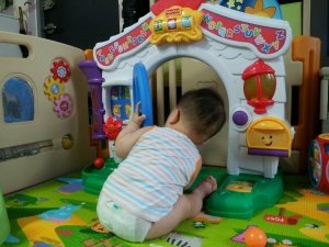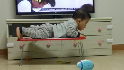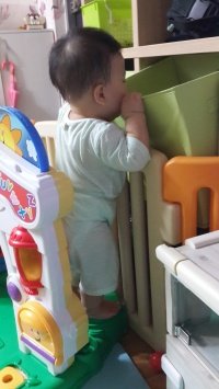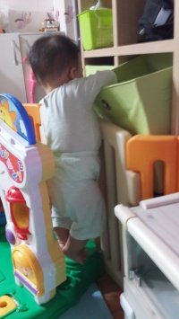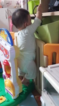 까치발하고 장난감통 만질려고하고