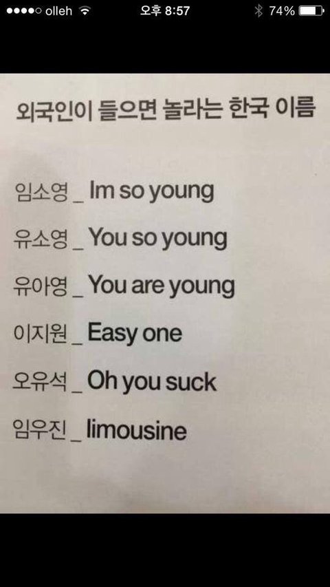 저런식으로 쓴다는게 아니라 외국인 한테 발음이 이렇게 들리다는 거인듯 임소영 im so young 난 너무 어려 유소영 you so young 넌 너무 어려 유아영 you are young 넌 어려 이지원 easy one 쉬운 사람? 얕보이는 사람? 그런 의미 인듯 오유석 oh you suck 니 좃가틈 임우진 limousine 리무진 ㅋㅋ