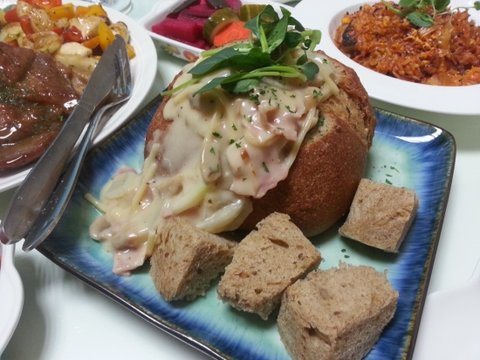 호밀빵 속을 파내어 크림스파게티를 곁들인 빠네