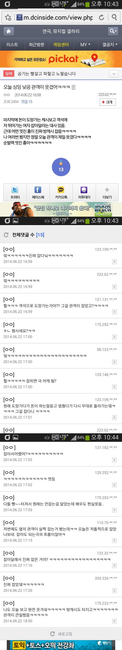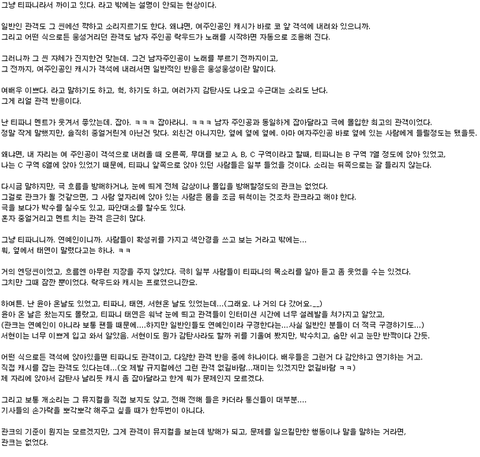 그렇게 따지게 되면 도망가는 여주를 진짜 잡아서 관객 뿐 아니라 배우까지 웃음 터지게 만든 일반관객의 행동은 티파니의 행동보다 더 민폐스러운 행동이 되는 거임.