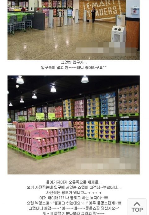 대형마트는 사진찍으면 쫓아나오는데ㅋ 보안팀에서 뛰쳐나오고, 판매하거나 진열하는 직원아주머니들의 눈빛도 매의 눈으로 변함. 마트안에서 사진찍고싶음 미리 허락받아야 가능함. 그냥 자기 일상블로그하려면 조용히하지 블로그하는 뇨자라니;; 블로그하는 뇨자가 수만명은 되는고만ㅋ