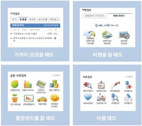 가격정보, 여행정보, 금융/보험정보, 의료정보 등 다양한 정보가 제공되고 있으며