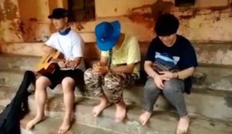 제목의 영상에는 한국인 남성 2명과 여성 1명이 불당 사원 내부에서 기타를 치며