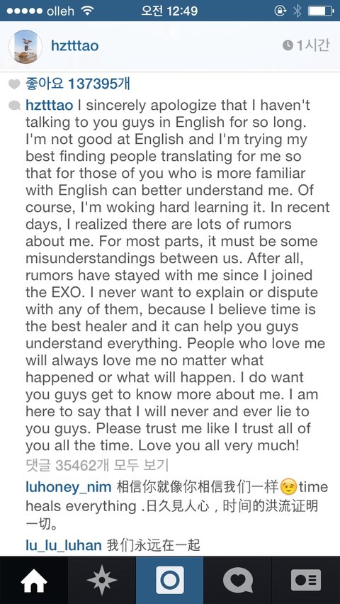 대부분의 것들이 우리사이에 오해에서 비롯 된 것이예요. 엑소를 시작했을 때 부터 루머는 계속 따라다녀 왔어요. 하지만 전 그누구에게도 루머를 설명하거나 반박하는걸 원하지 않았어요. 왜냐하면 시간은 모든것을 해결해주고 여러분들을 이해시킬 수 있다고 믿기 때문이예요. 저를 사랑해주시는 분들은 무슨일이 있었든 앞으로 무슨일이 일어나든 저를 항상 사랑해주세요.