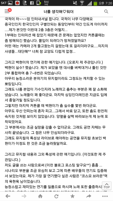 블로그에서본건데 난어제8시에갔는데도 후기랑비슷하다 우산펴는안무때 조카두리번거리면서 옆에보고따라하고 한템포늦고..대사실수하고..에휴