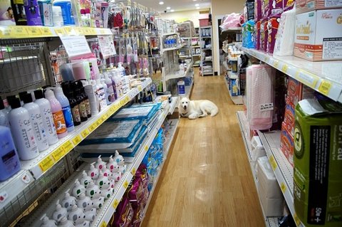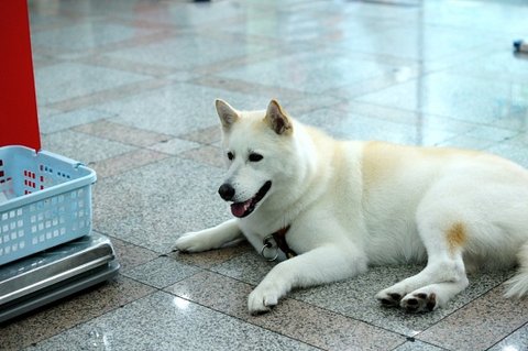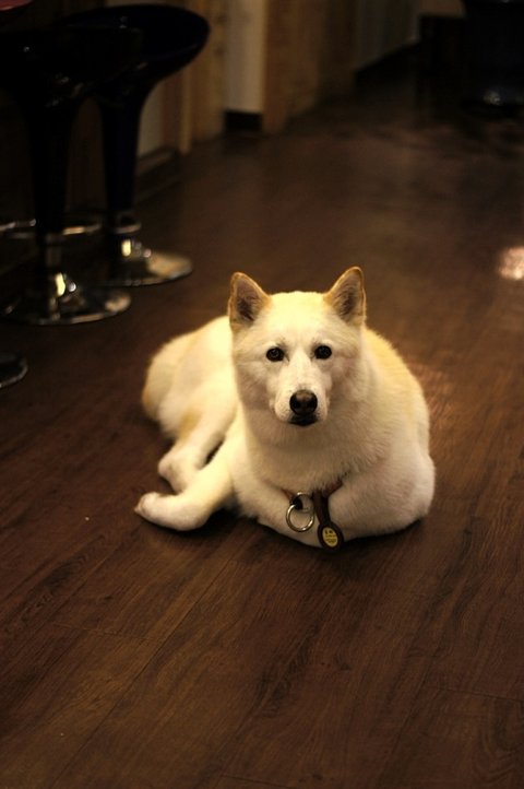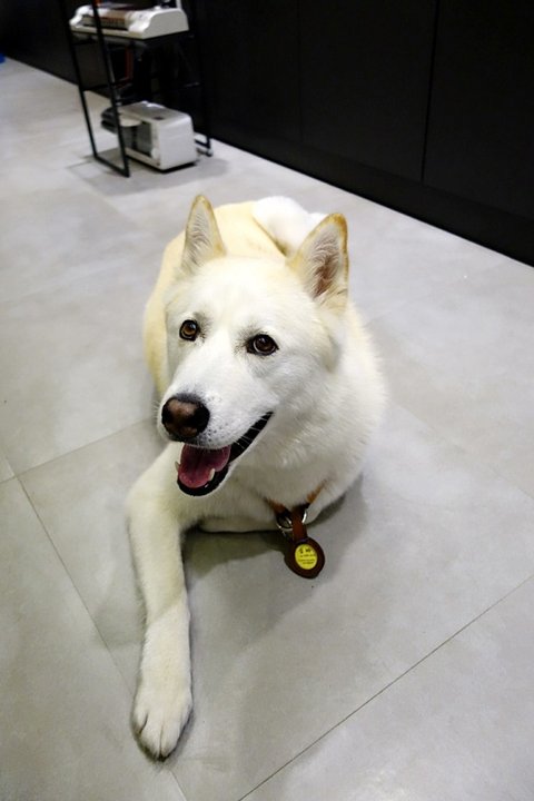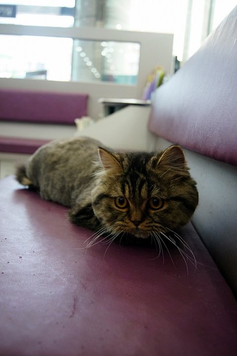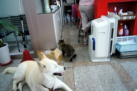 동물병원에 놀러와서 누워 있는데 마이가 나타났어요.